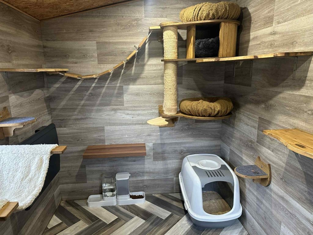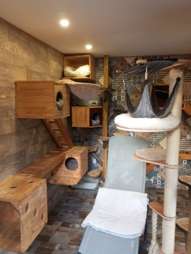 La maison est essentiellement dédiée aux chats, dans le salon un très bel espace en hauteur. Les chats vivent en harmonie au sein de la maison, cependant vu qu’ ils sont quand même nombreux il a fallu prévoir des espaces pour chacun et ainsi respecter leurs besoins.